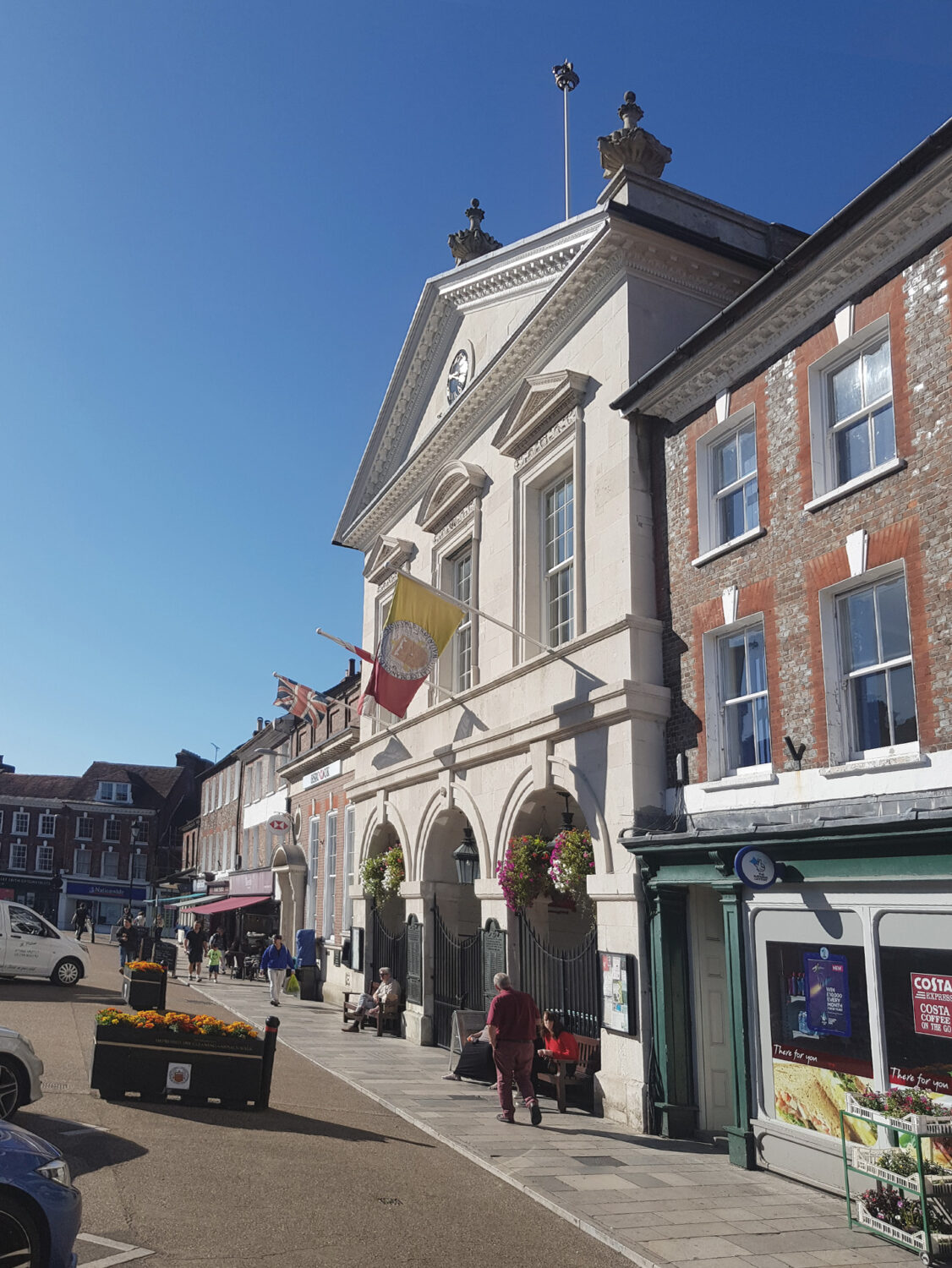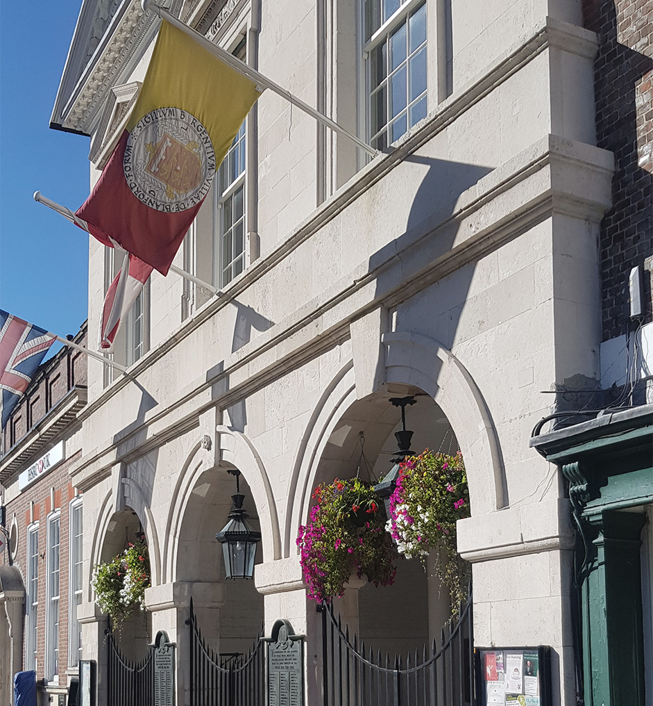 Built in 1734, of Portland stone, and featuring a classical Palladian façade, the Town Hall is considered by many to be the jewel of Blandford Forum’s Market Place and a building of exceptional architectural interest. Eagle-eyed passers by will notice the high level or-nate plasterwork that adorns the building and the fossils embedded within the Port-land stone