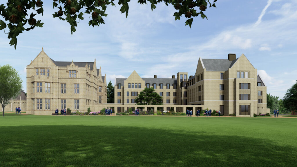 Currently on site, the new buildings will soon be adding a new element to the historic estate. The accommodation is designed as a contemporary interpretation of the adjacent Monteacute House. Prominent gables face onto the quad and Beaufort Lawn, and the corner of the block is distinguished with a modern cupola tower and “mousehole” walkthrough.