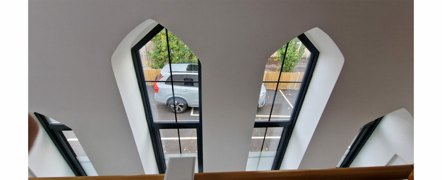 We soon saw an opportunity to create attractive new dwellings, taking advantage of the buildings historic form and traditional features. The building naturally divides front to back along the chimney line, which we exploited to define each of the properties. Externally, we removed the roof from the bulky rear shed however, have retained the brick walls to provide attractive walled gardens. Internally, the first floor has been pulled away from the tall windows to allow these to be expressed internally and to flood the ground floor with light. The original windows allowed for the creation of interesting and unusual details, such as the low level shuttered windows in the bedroom and the small window on the stair.