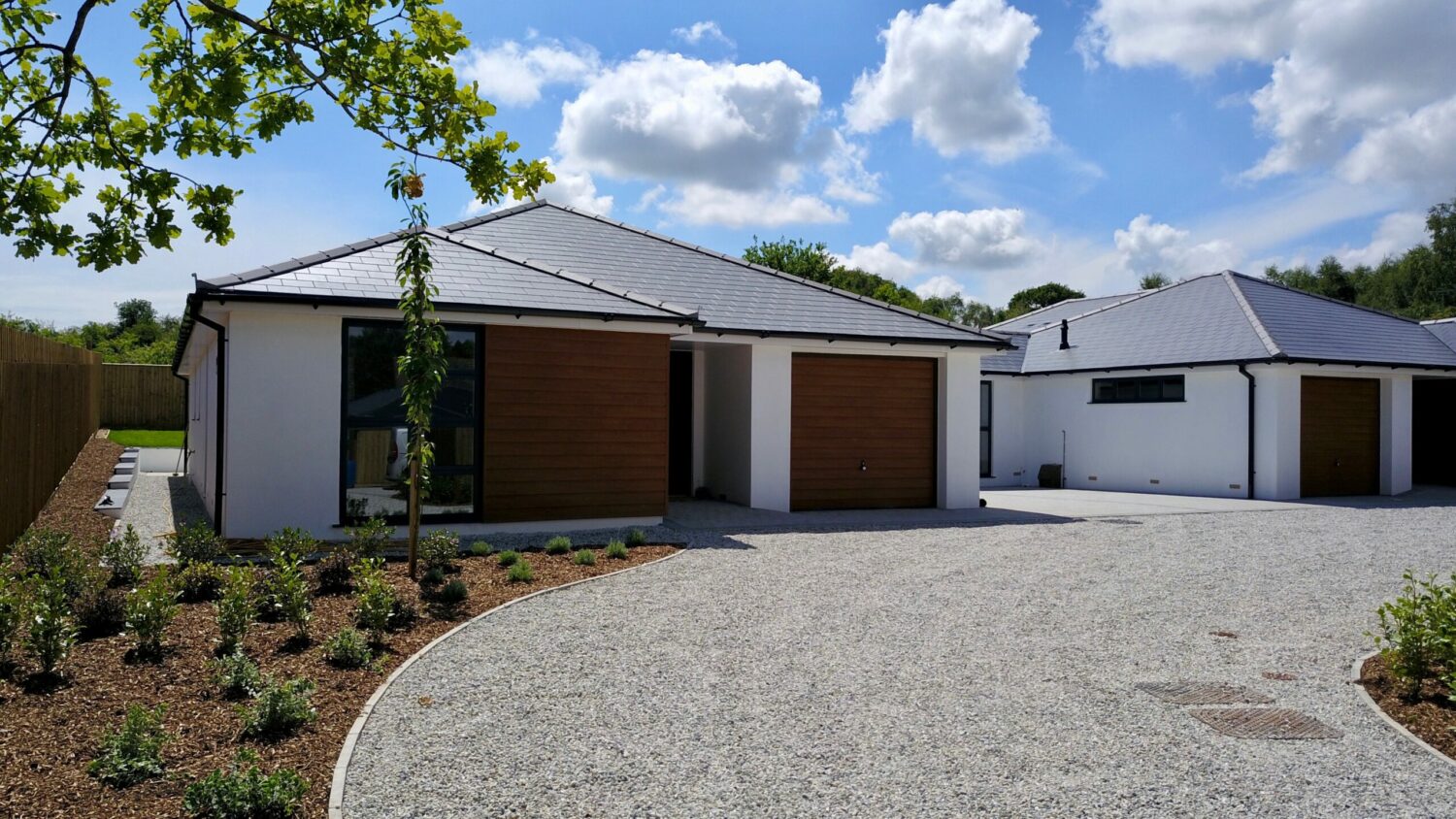 The choice of materials contributed greatly to the overall feel of the development. Elegant and wide timber entrance, recessed within generous porches, and large, high quality anodised aluminium windows with slender frames to maximise light, all help create a contemporary architectural character, further enhanced by the crisply detailed, light render and deep eaves.