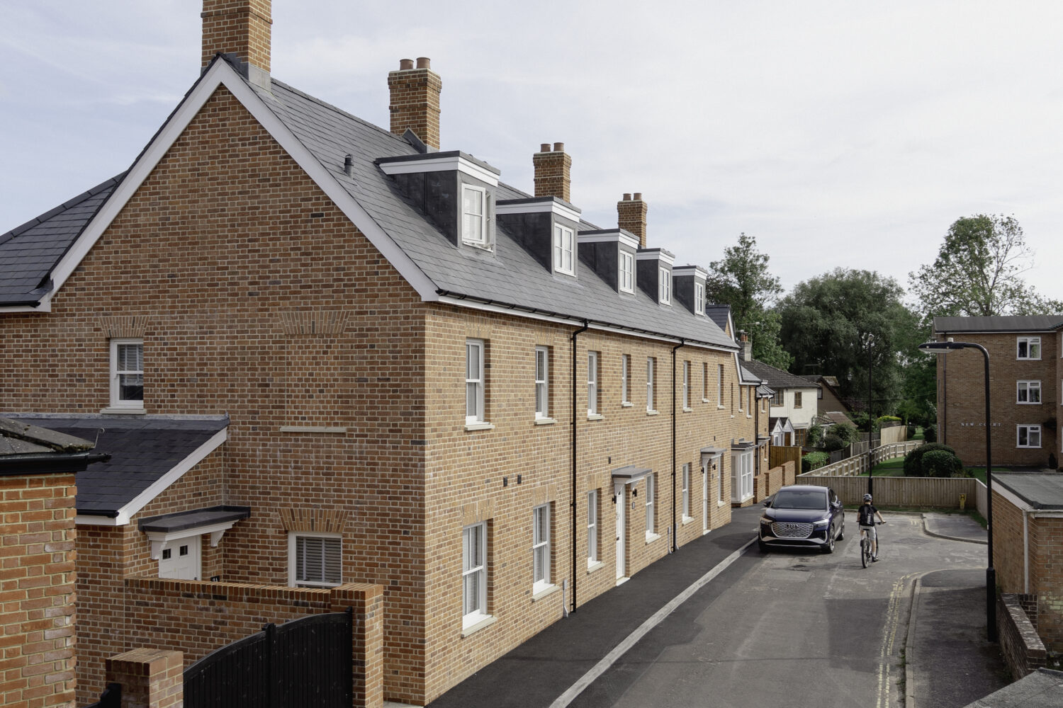 The homes are built in high quality red brickwork, under natural slate steeply pitched roofs, with well detailed timber joinery. Every house is heated by an air source heat pumps, and equipped with its own charging point and dedicated off street parking, ensuring the development meets current standards of sustainability.