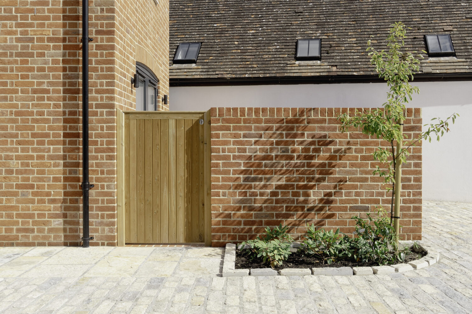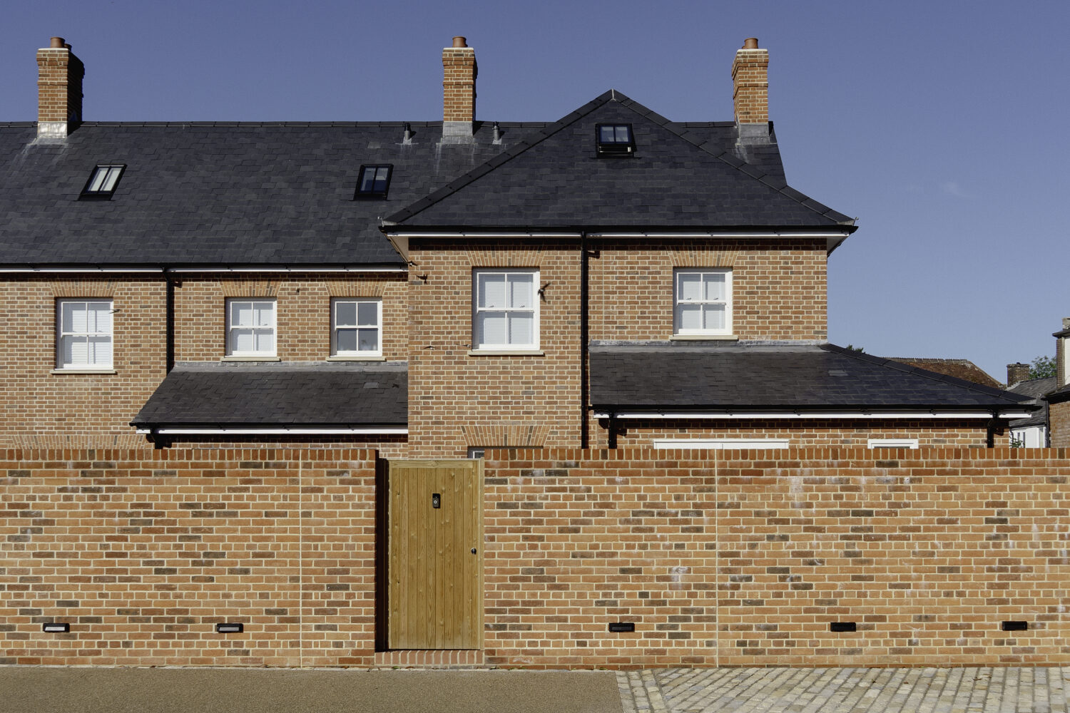 High quality red brickwork, under natural slate steeply pitched roofs, with well detailed timber joinery.