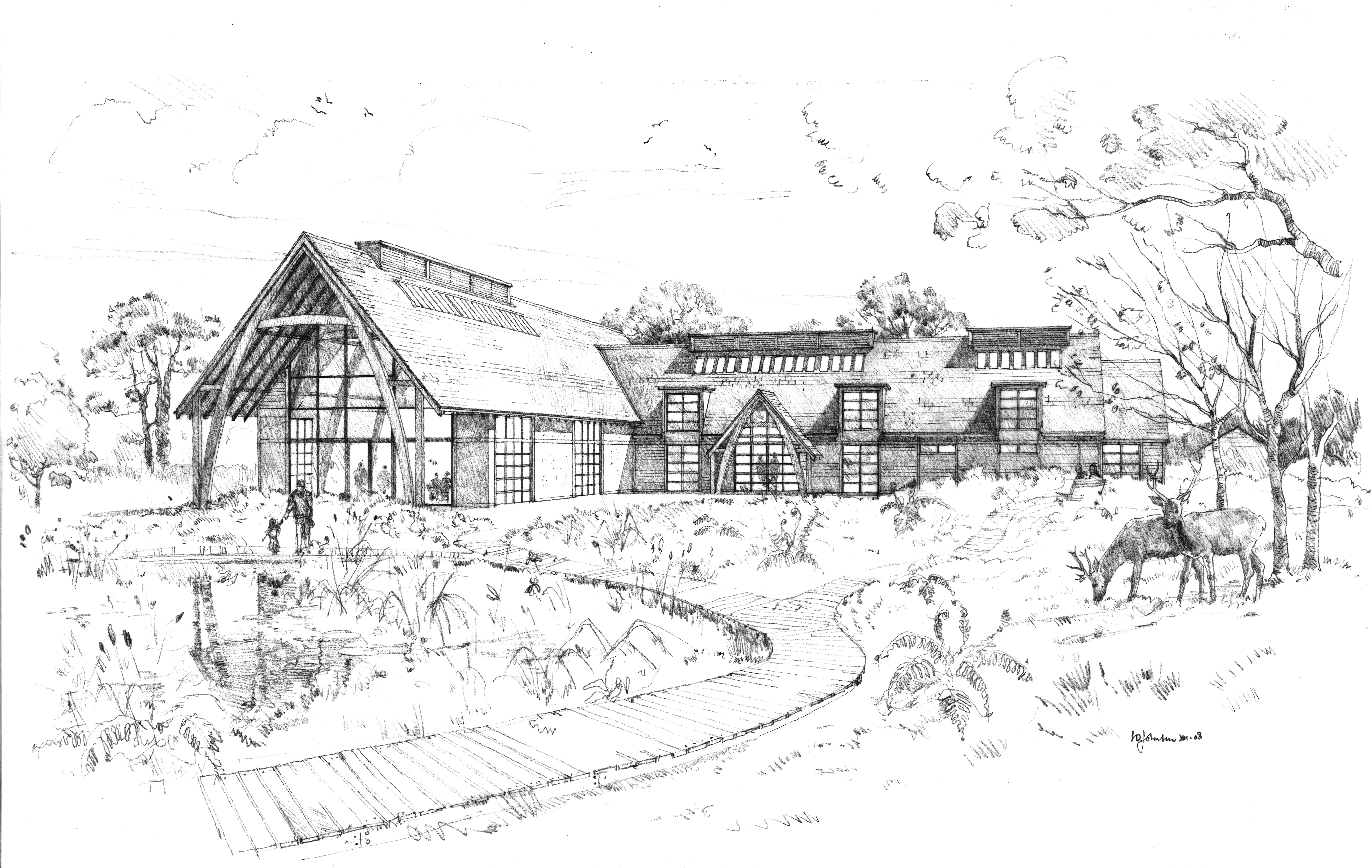 Both the restored and new buildings will be constructed to sustainable design standards, with photo-voltaic cells, grey water recycling, and green roofs, integral to the design. Externally, a Landscape Interpretation Zone is to be created – a microcosm of the main typical natural environments found in the Forest. This will be managed by ecological and landscape specialists on an ongoing basis to ensure a living and evolving education resource is available for years to come to visitors, accessed by a circular boardwalk.