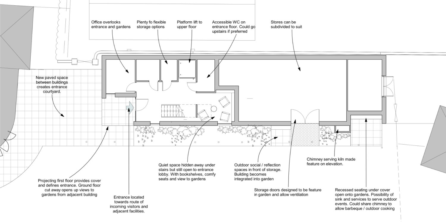 The pavilion is designed with the wellbeing of staff and trainees in mind. The entrance hall is double height with a broad stair drawing visitors upstairs to the main teaching and social spaces. Under the stairs is a secluded library / wobble room to escape the crowds, with intimate views onto planting and gardens.